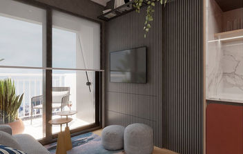 A entrada ao studio é feita por um cubo marsala que abriga a cozinha, com um mix de soluções que priorizam o conforto e a praticidade em apenas 1,35m de comprimento. De um lado, liberamos a bancada para funcionar como área de trabalho, transformando o gaveteiro em uma ilha móvel para o fogão. Do outro, a marcenaria abraça a geladeira, tornando as proporções do ambiente iguais para a melhor harmonização possível. A sala, com uma vista incrível para a selva de pedras, é espaço de otimização. A mesa se esconde no painel, aumentando as circulações e diminuindo a poluição visual.